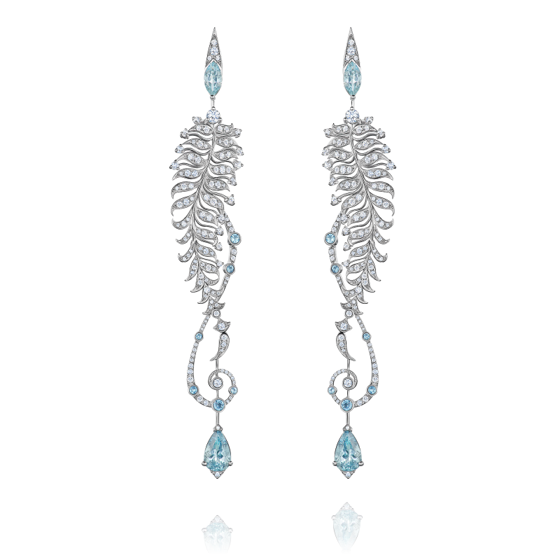 Aquamarines of pear, marquise and round cut. Round-cut diamonds.